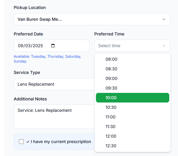 Book an appointment at the Van Buren Swap Meet? Only Tuesday, Thursday, Saturday, and Sunday appear. Main office? Weekday options only. No confusion.