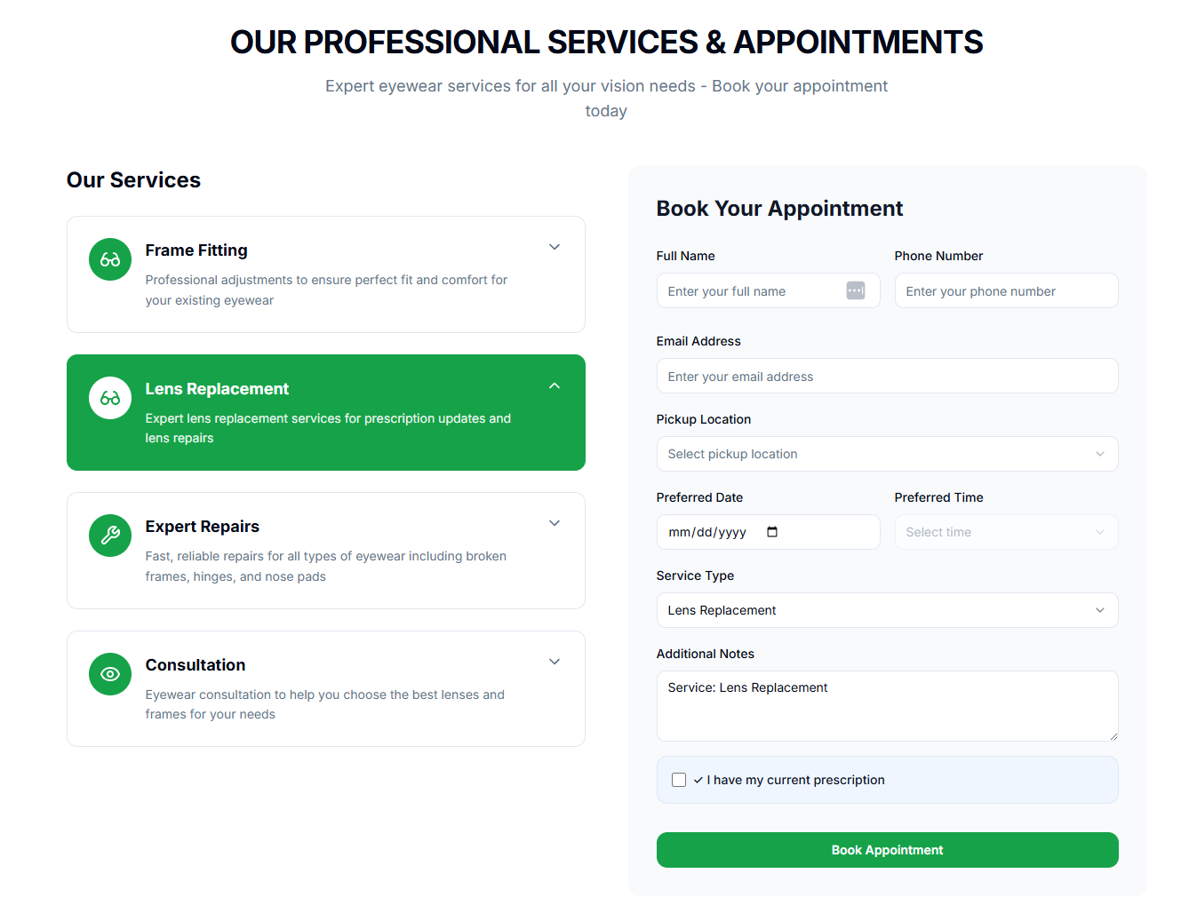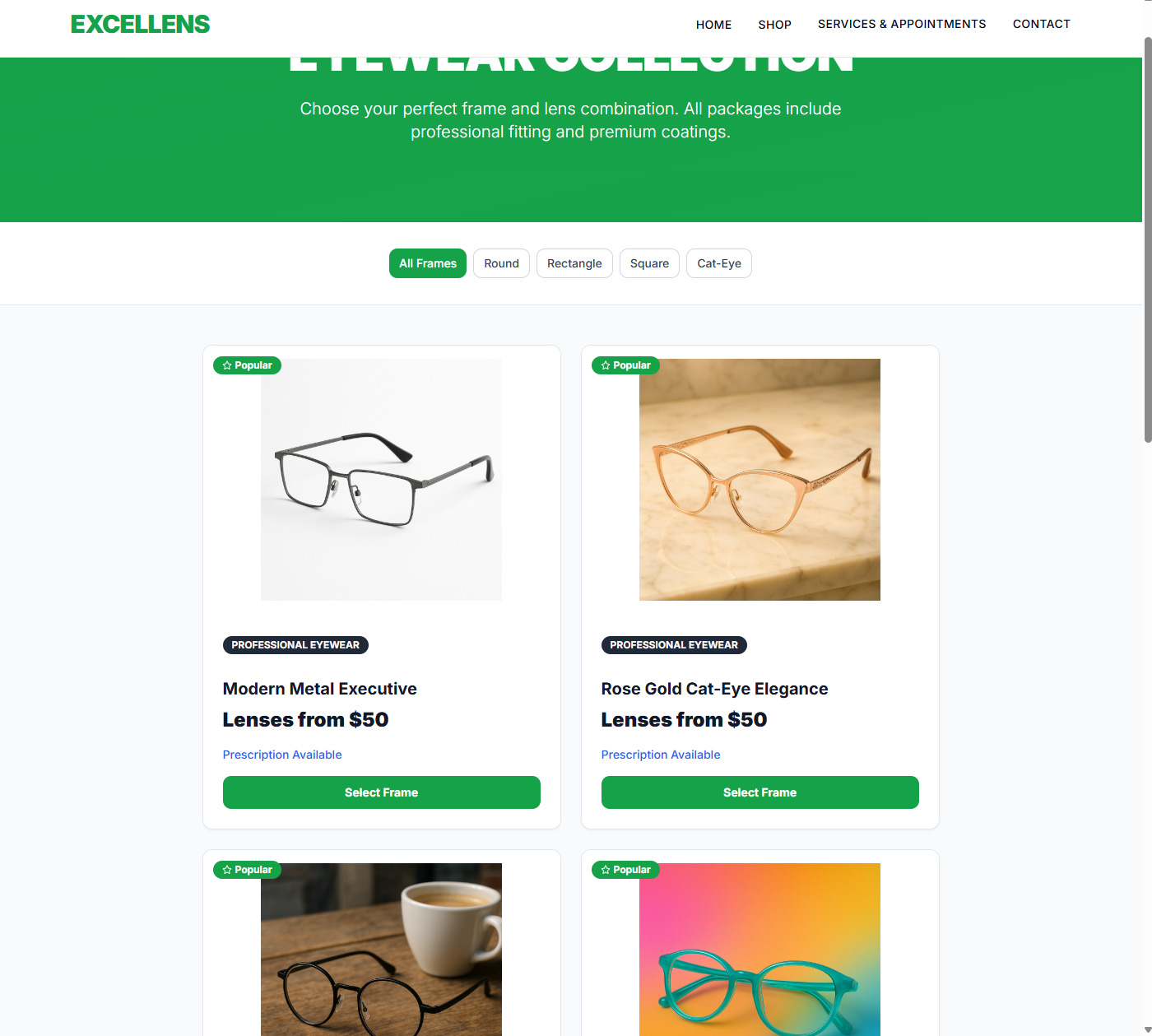 Browse frames by style, shape, or brand with high-quality images from every angle. Customers can see exactly what they’re getting before they walk in.