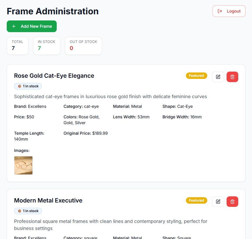 Behind the scenes, Excellens staff can log in to a secure admin page where they manage their eyewear catalog in real time. New frames, updated stock, and product details appear instantly on the customer-facing site—no IT help required.