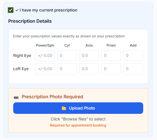 Need new lenses? Upload your prescription photo or enter the details directly on the site. Everything’s ready when you arrive.